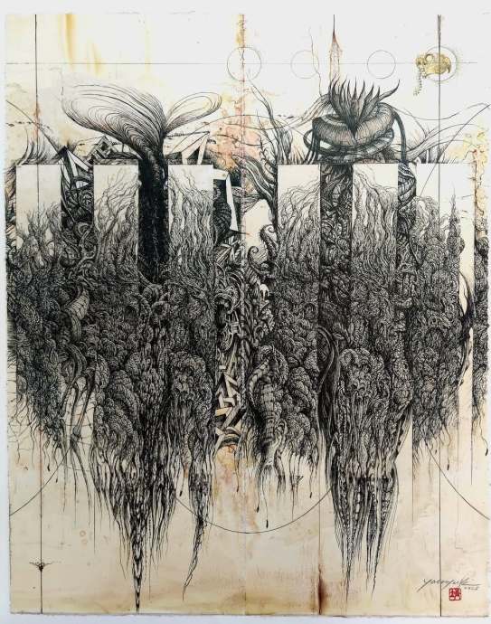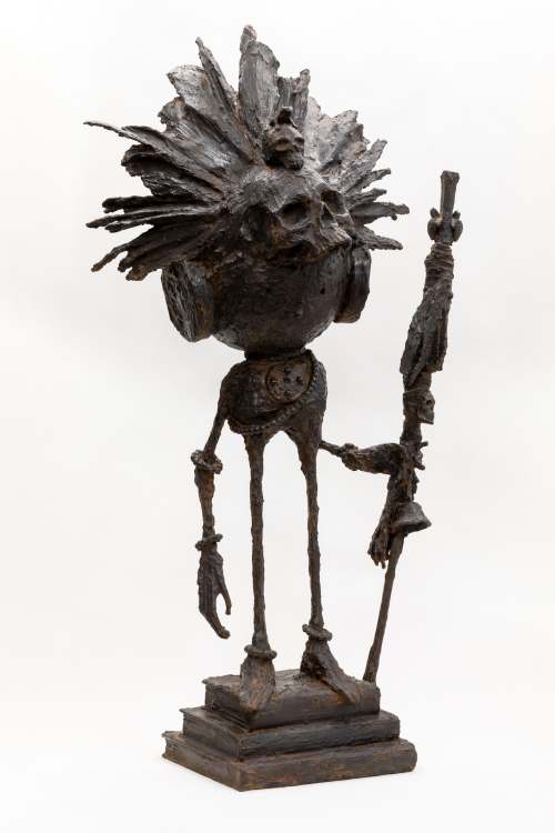 “The Scorpion of Malice”, “Salvobedort, the Dark Hunter”, “Alien City”, and “King Fire” are just some of the titles of the works on display: dragons, witches, vampires, and warriors rise to tear away the veil of anxiety. The more you look at, the more you enter a visionary universe, an interior and mental journey of transformation through precarious architecture, totems, and visual worlds within which the eye becomes lost.