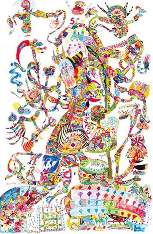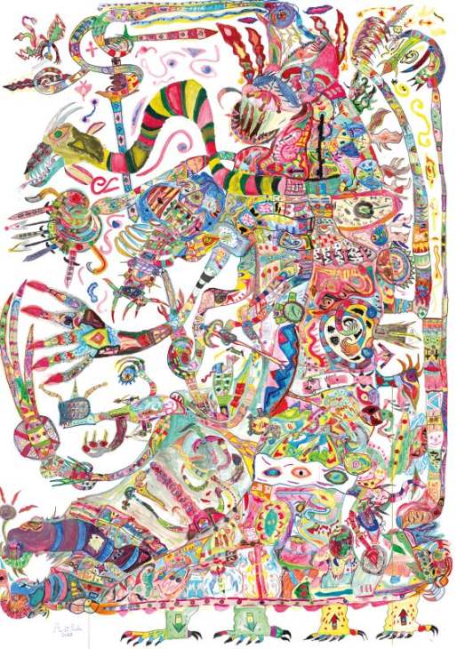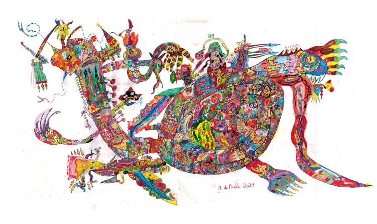 Many of the titles of the sixteen large-scale works, draw on the world of fantasy but even the most evil of those monsters is transformed by Di Paola through vibrant colours and a multitude of signs and patterns, evoking a sense of inner chaos. The fearsome characters, equipped with claws, pincers, sharp teeth, electric tails, spines, and swords, are the fruit of Antonio’s sensitivity and overflowing imagination, as he seeks to control them through form and colour. “The story comes at the end,” Antonio explains. “First, the general idea of the composition arises in my head. By drawing, I transfer the linear structure to the sheet of paper, which only later, with the addition of colour, comes to life, and then the battle begins. Colour is a weapon of attack and defense.”