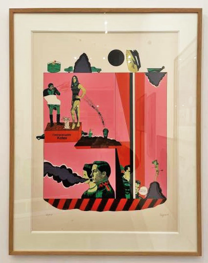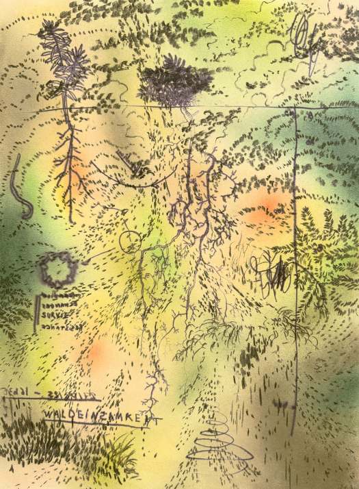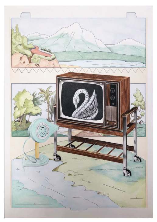“In the artist’s repertoire,” writes di Stefano in the critical essay in the catalog, “colours have their own symbolic value, and if blue is ice, red is fire, lava, the blood of the earth, while yellow is power, green is poison… The overall effect is playful, decorative, and at the same time disturbing. Even virtuosic, in the combined use of mixed techniques, including watercolor, acrylic, oil pastels, pigments, and ecoline.”